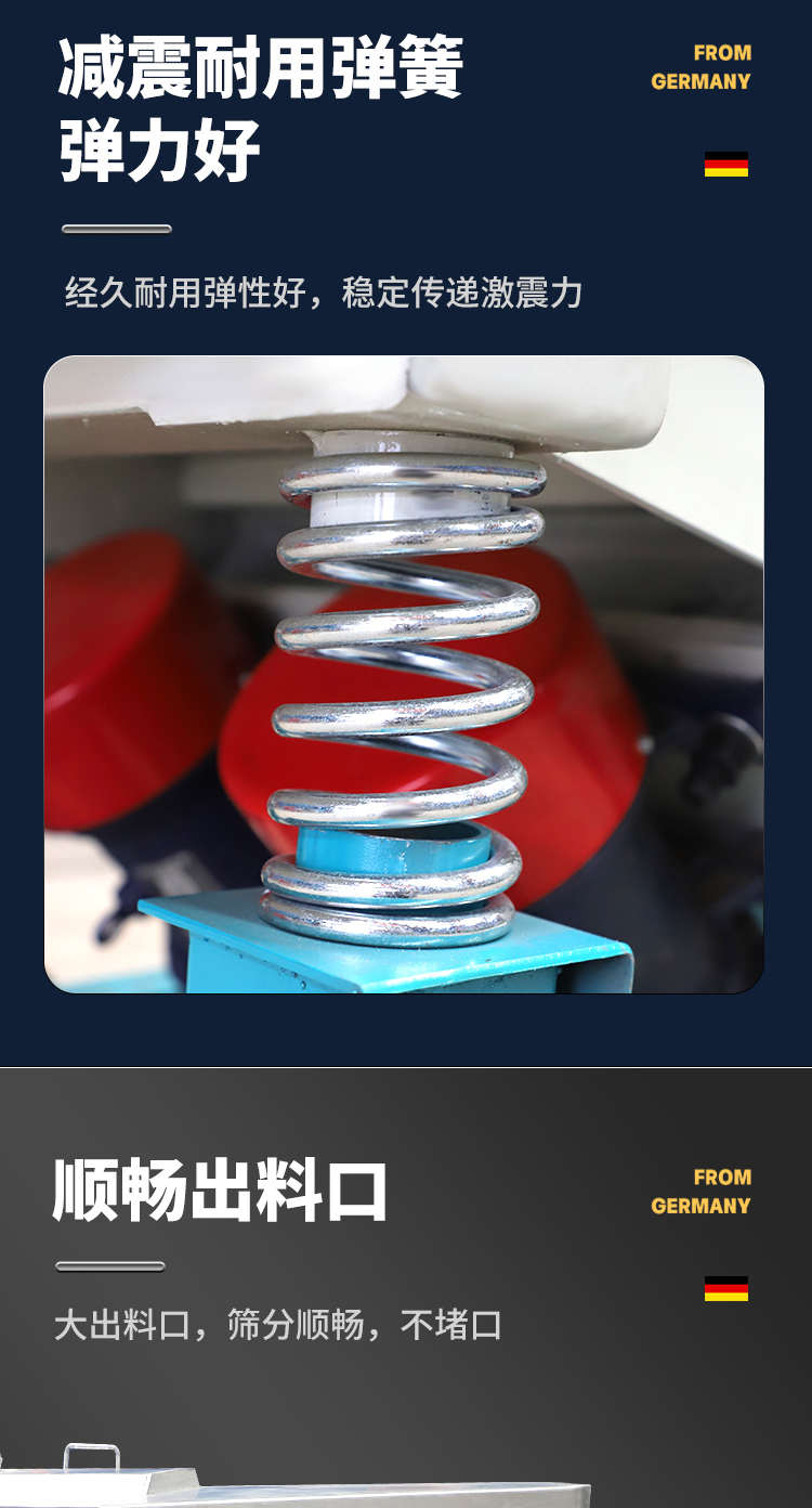 直線振動篩采用雙振動電機(jī)驅(qū)動,當(dāng)兩臺振動電機(jī)做同步、反缶旋轉(zhuǎn)時,其偏心塊所產(chǎn)生的激振力在平行于電機(jī)軸線的方向相互抵消,在垂直于電機(jī)軸的方向疊為一合力,因此振動篩的運(yùn)動軌跡為一直線。其兩電機(jī)軸相對篩面有一傾角,在激振力和物料自重力的合力作用下,物料在篩面上被拋起跳躍式向前作直線運(yùn)動,從而達(dá)到對物料進(jìn)行篩選和分級的目的。可用于流水線中實(shí)現(xiàn)自動化作業(yè)。具有能耗低、效率高、結(jié)構(gòu)簡單、易維修、全封閉結(jié)構(gòu)無粉塵溢散的特點(diǎn)。篩分目數(shù)325目,可篩分出7種不同粒度的物料。