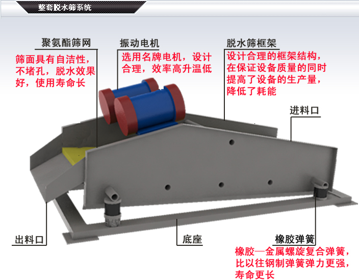 脫水篩又稱高頻脫水篩,通過(guò)激振力改變了礦漿表面的水張力,漿水透過(guò)篩網(wǎng)成為篩下物,而微細(xì)物料被篩網(wǎng)阻隔形成濾層受振動(dòng)力影響向前運(yùn)動(dòng)排出。脫水篩主要用于選礦行業(yè)的尾礦脫水、選煤廠的煤泥脫水、水洗石英砂脫水和陶瓷泥漿脫水,以及電力、制糖、制鹽等工業(yè)部門對(duì)中細(xì)顆粒物料進(jìn)行干濕式分級(jí)、脫水、脫介和脫泥。