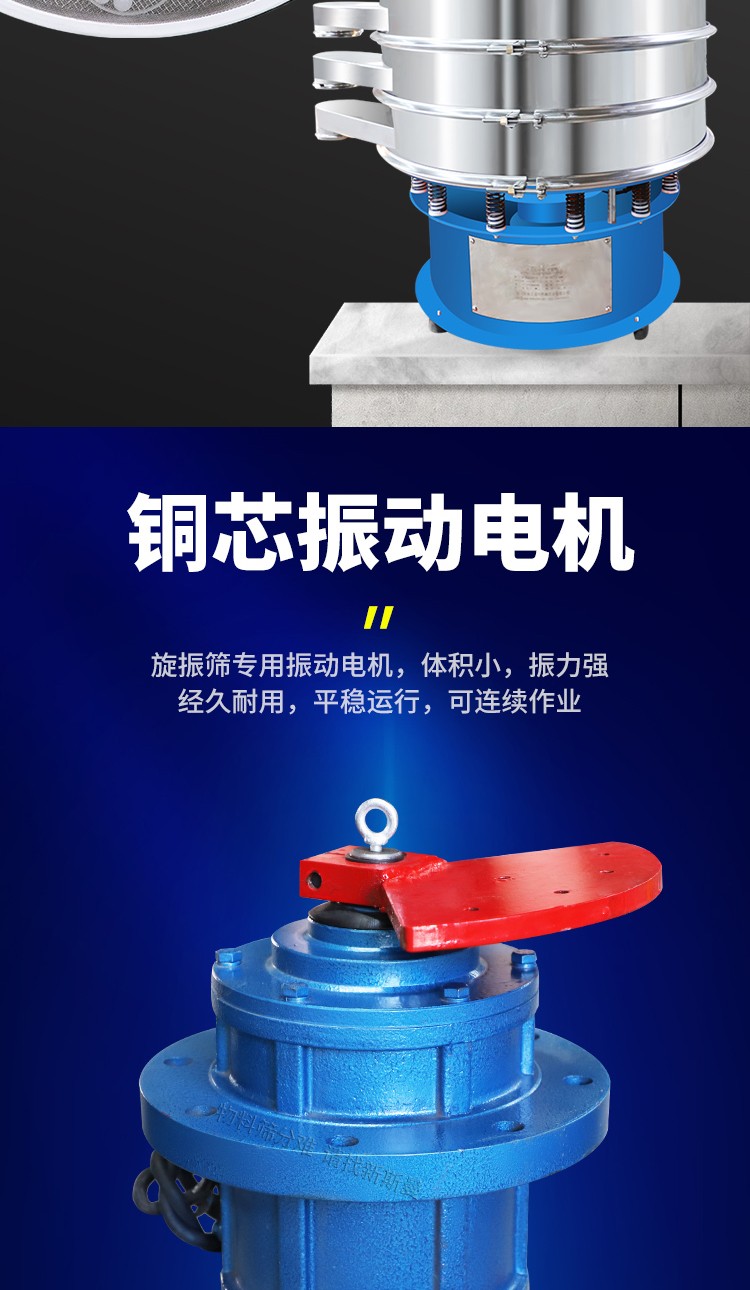 旋振篩是由直立式振動(dòng)電機(jī)作激振源,電機(jī)上、下兩端安裝有偏心重錘,將電機(jī)的旋轉(zhuǎn)運(yùn)動(dòng)轉(zhuǎn)變?yōu)樗健⒋怪薄A斜的三次元運(yùn)動(dòng),