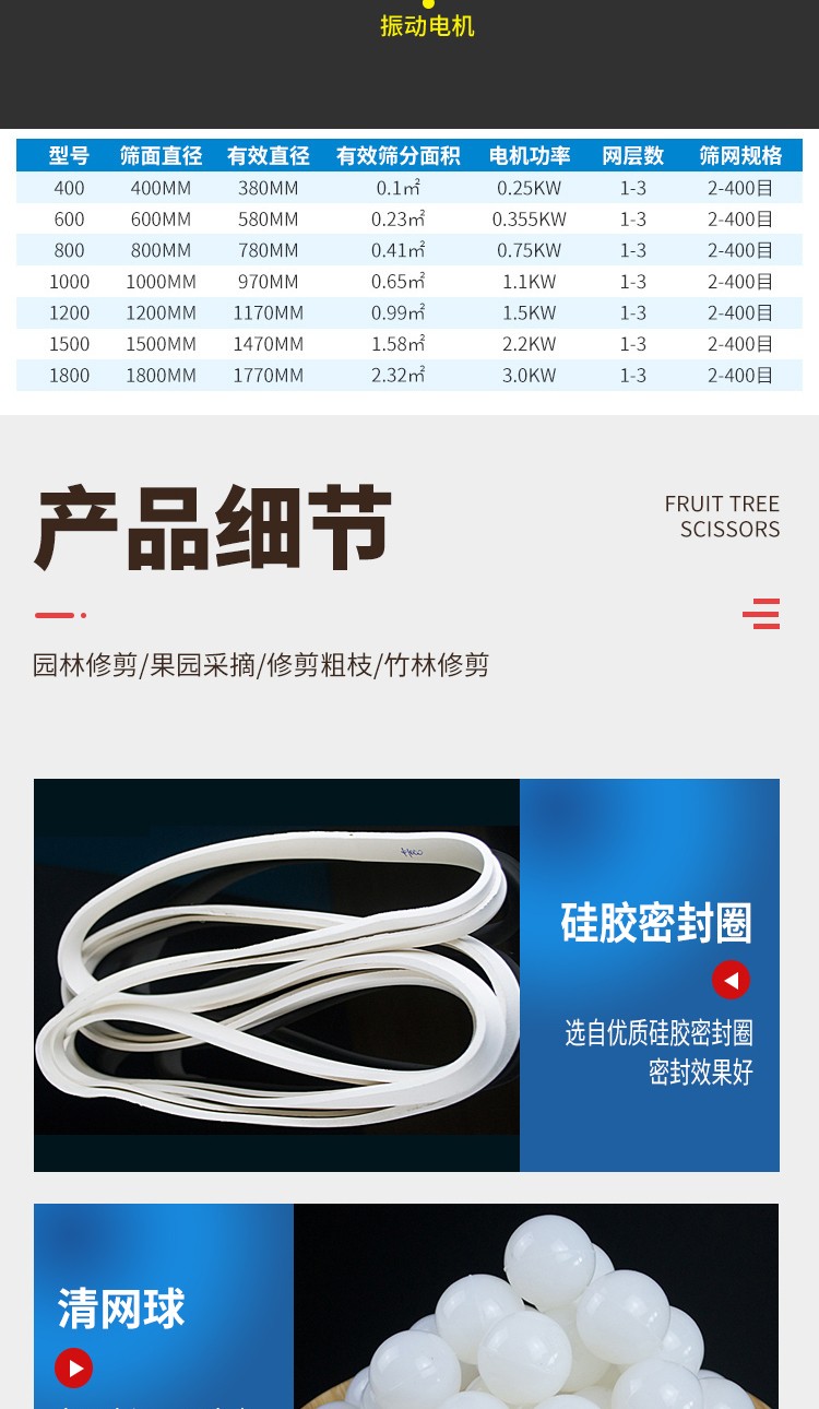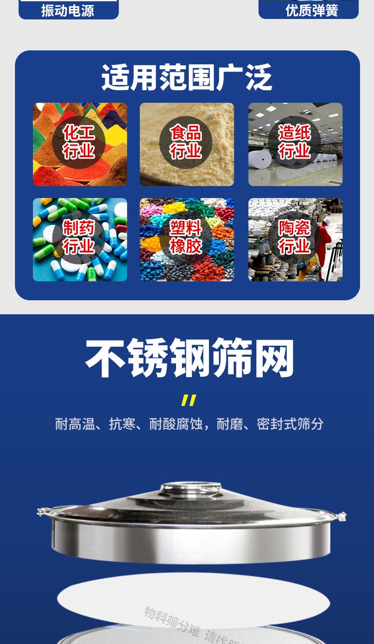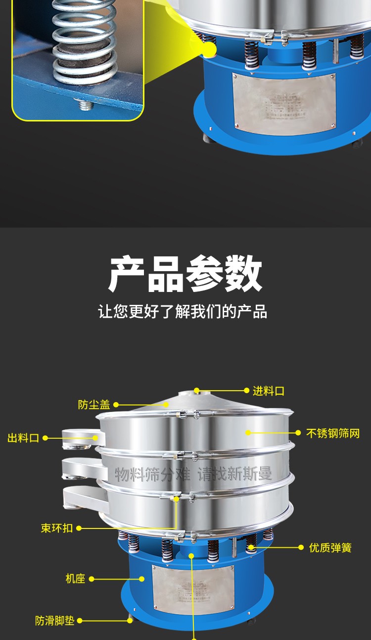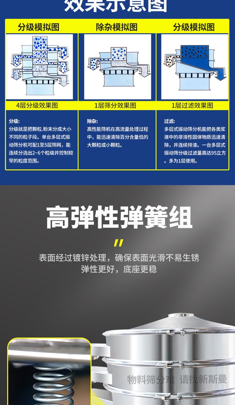 多層使用一次可分離篩選出六組不同粒徑的產(chǎn)品且不會(huì)出現(xiàn)顆粒大小比例不一致的現(xiàn)象,多適用于干物料的篩分。
