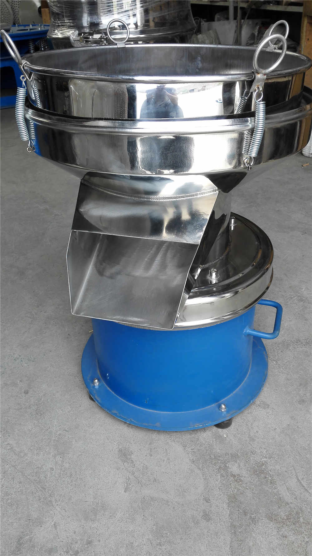 450型過濾篩是采用新型立式振動電機為振動源,立式振動電機上、下端裝有偏心重錘,
