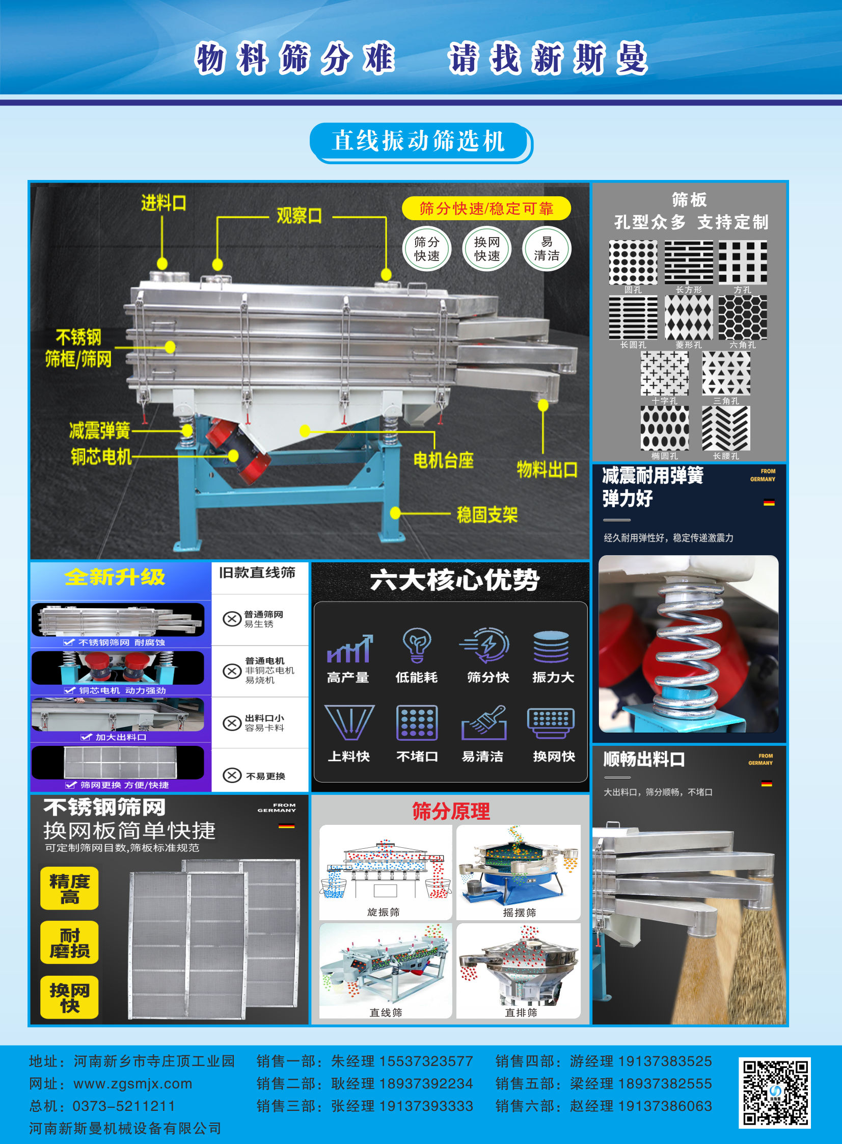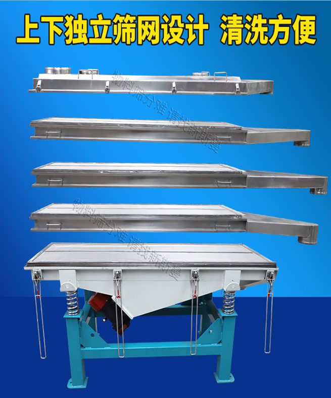 咨詢熱線:15537323577 多層可拆卸式直線振動(dòng)篩是在原普通直線振動(dòng)篩基礎(chǔ)之上,工藝改進(jìn)優(yōu)化出來的產(chǎn)品,上下獨(dú)立篩網(wǎng)和網(wǎng)架設(shè)計(jì),清洗方便,多層快速篩選,自動(dòng)排料。具有換網(wǎng)方便、快速拆裝、易清潔清洗、篩分快省時(shí)間、穩(wěn)定可靠,篩分效率高等優(yōu)點(diǎn)。是一種運(yùn)動(dòng)軌跡為直線的中、細(xì)物料篩分設(shè)備,廣泛用于選煤、選礦、電力、制糖、制鹽、化工、磨料、耐材、食品等行業(yè),對(duì)中、細(xì)粒度物料進(jìn)行干、濕式篩分或脫水、脫介、脫泥作業(yè),是高效率篩分的首選產(chǎn)品。