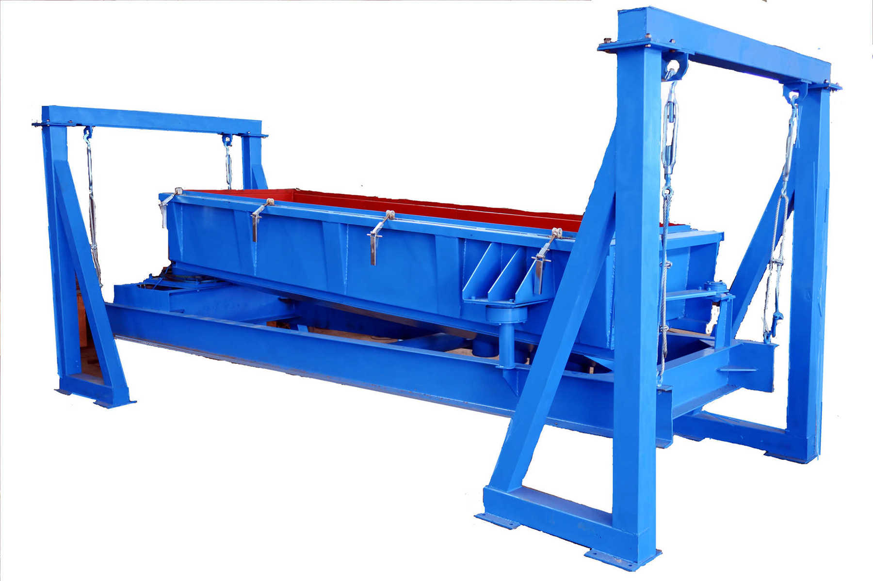 b、安裝完畢,檢查調(diào)整各級彈簧,使各支撐位置受力均勻,電動(dòng)機(jī)軸線應(yīng)低于振動(dòng)器軸線3-5mm,對稱點(diǎn)支撐彈簧應(yīng)水平等高(誤差≤3mm)。