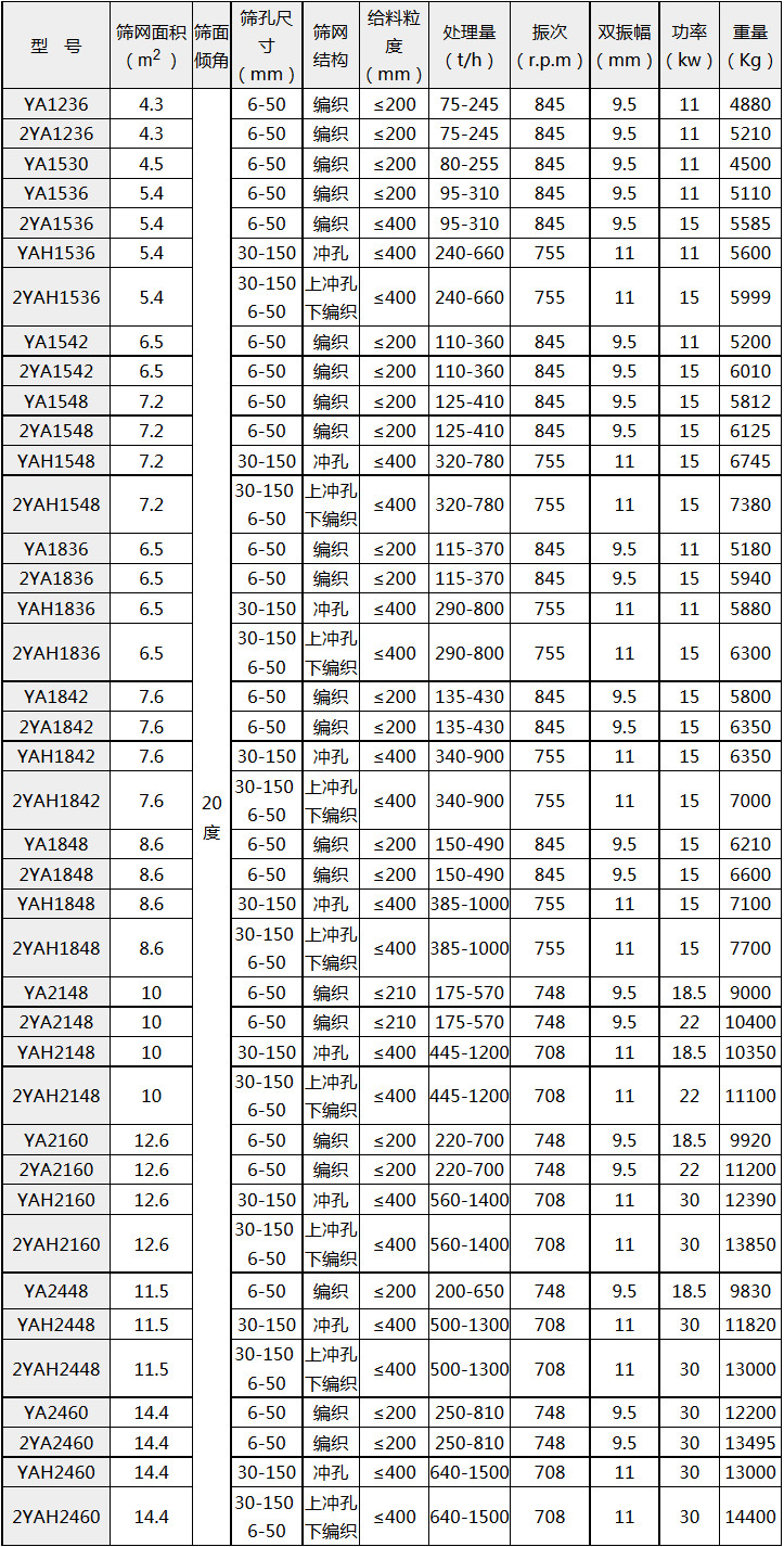 YA系列圓振動(dòng)篩的主要技術(shù)參數(shù):