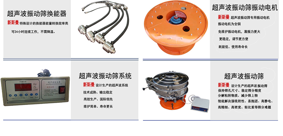超聲波振動(dòng)篩是將220V、50Hz或110V、60Hz電能轉(zhuǎn)化為36KHz的高頻電能,輸入超聲換能器,將其變成36KHz機(jī)械振動(dòng),產(chǎn)生的功率超聲波使篩網(wǎng)作高頻振動(dòng)。篩網(wǎng)上的物料在作低頻旋振運(yùn)動(dòng)的同時(shí),疊加上超聲振動(dòng),既可防止網(wǎng)孔堵塞,又可使篩分機(jī)提高產(chǎn)量和質(zhì)量,從而達(dá)到快速篩分和清網(wǎng)的目的,使超微細(xì)粉篩分成為易事。該系統(tǒng)在傳統(tǒng)的振動(dòng)篩基礎(chǔ)上在篩網(wǎng)上引入一個(gè)低振幅、高頻率的超聲振動(dòng)波(機(jī)械波),以改變超微細(xì)分體的篩分性能。特別適合高附加值精細(xì)分體的用戶使用。